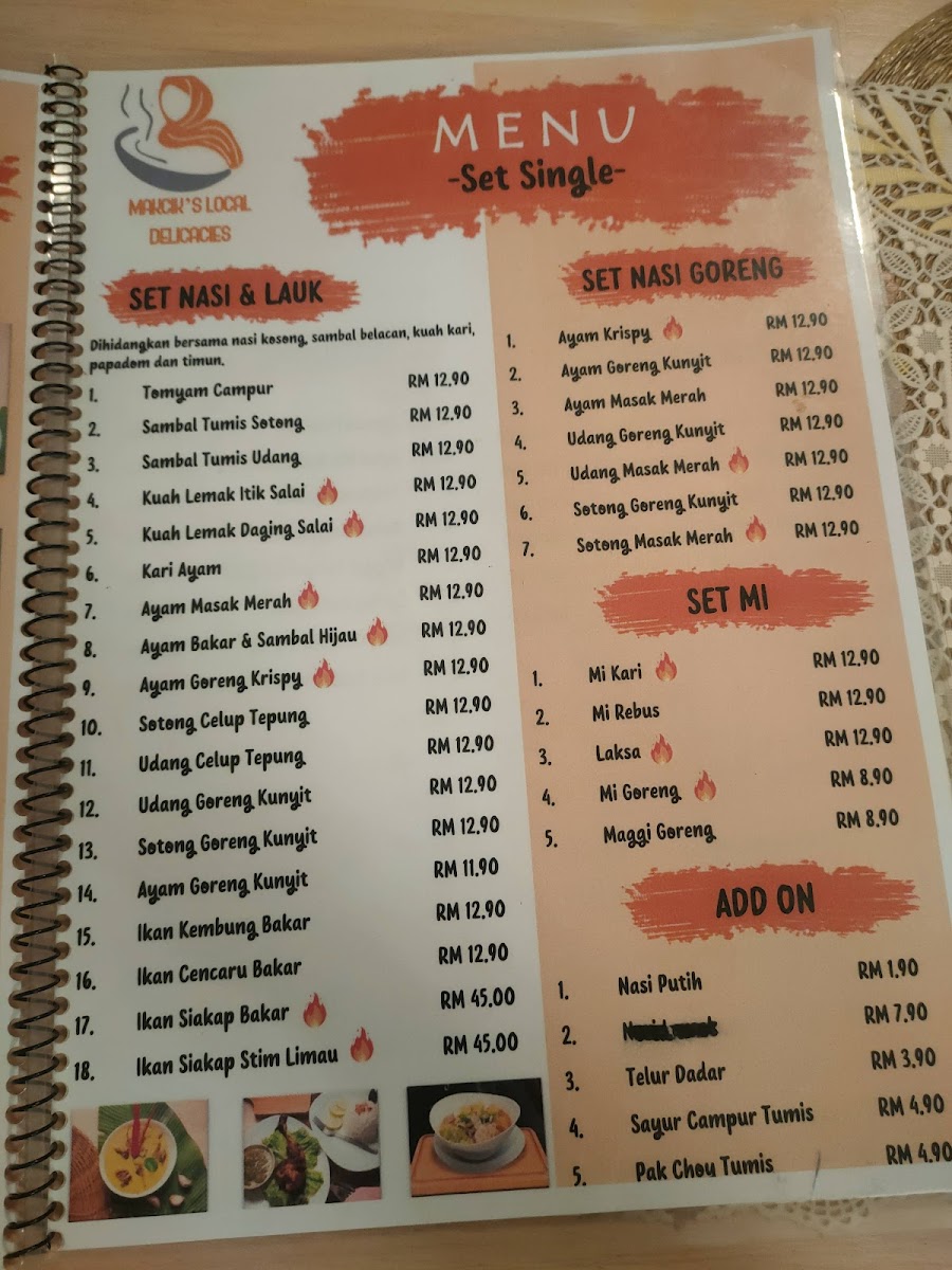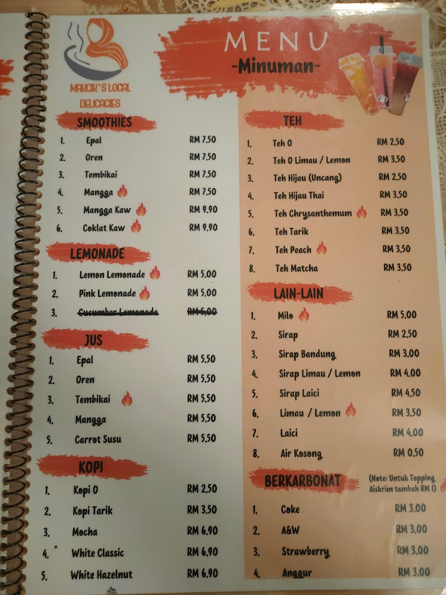 The menu offers a variety of local Malaysian cafe-style dishes, featuring traditional favorites and a selection of beverages. Food options include noodle dishes such as laksa and mee kari, rice-based meals like nasi goreng kampung and nasi lemak sambal sotong, as well as set meals including set dulang and set talam. There are also various snack and light bite choices including mixed balls, spring rolls, roti, and sotong goreng tepung. Seafood items such as steam fish and sambal udang are available as well.